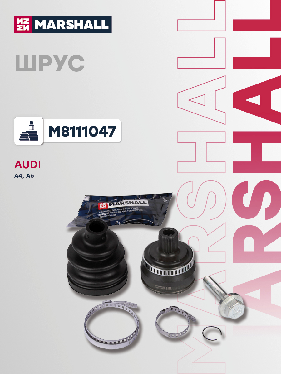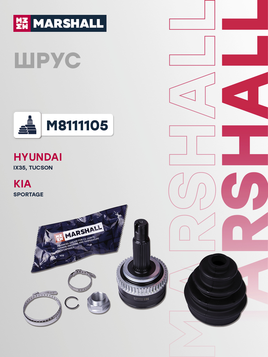 В комплект входит 1 шрус, 1 пыльник, 1 смазка, 1 болт, 2 хомута, 1 стопорное кольцо