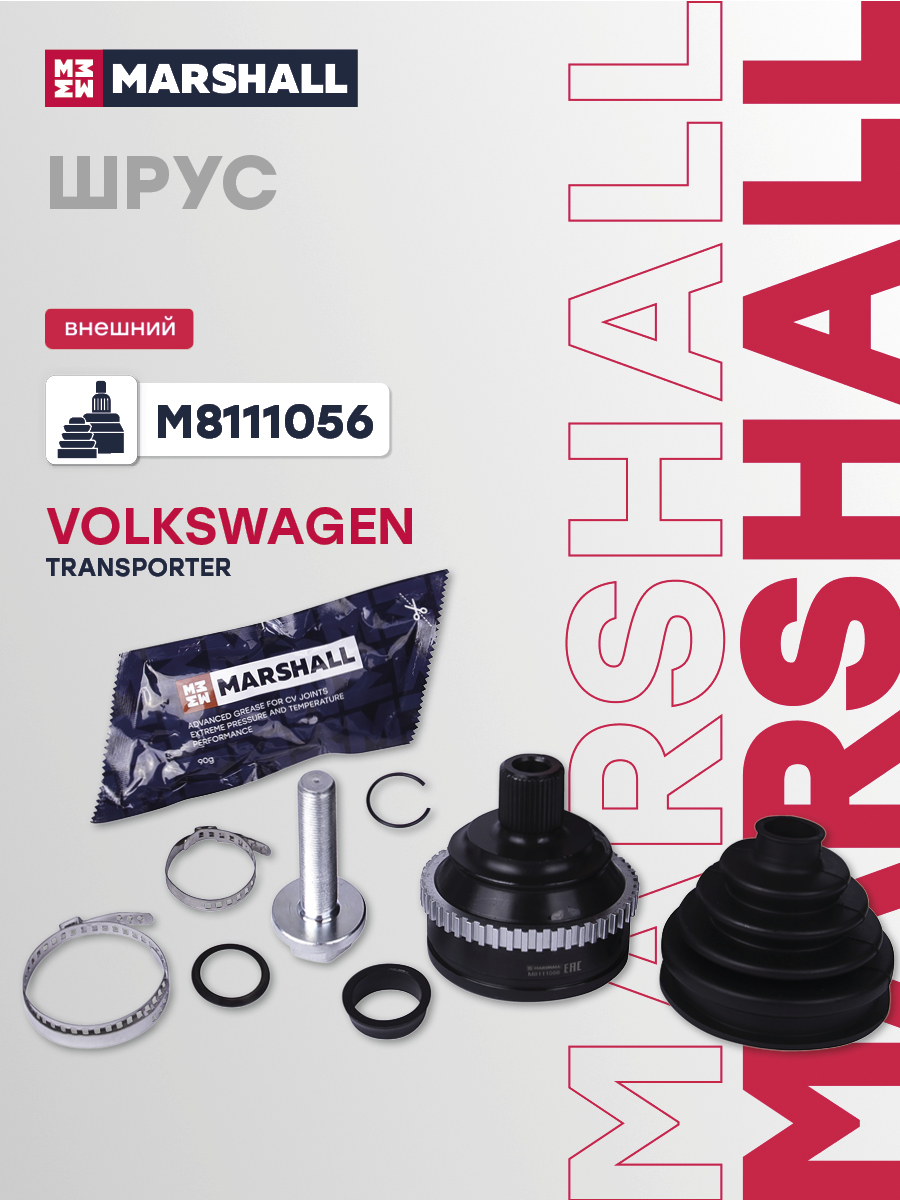 В комплект входит 1 шрус, 1 пыльник, 1 смазка, 1 болт, 2 хомута, 1 стопорное кольцо, 1 нейлоновая прокладка, 1 пружинная шайба