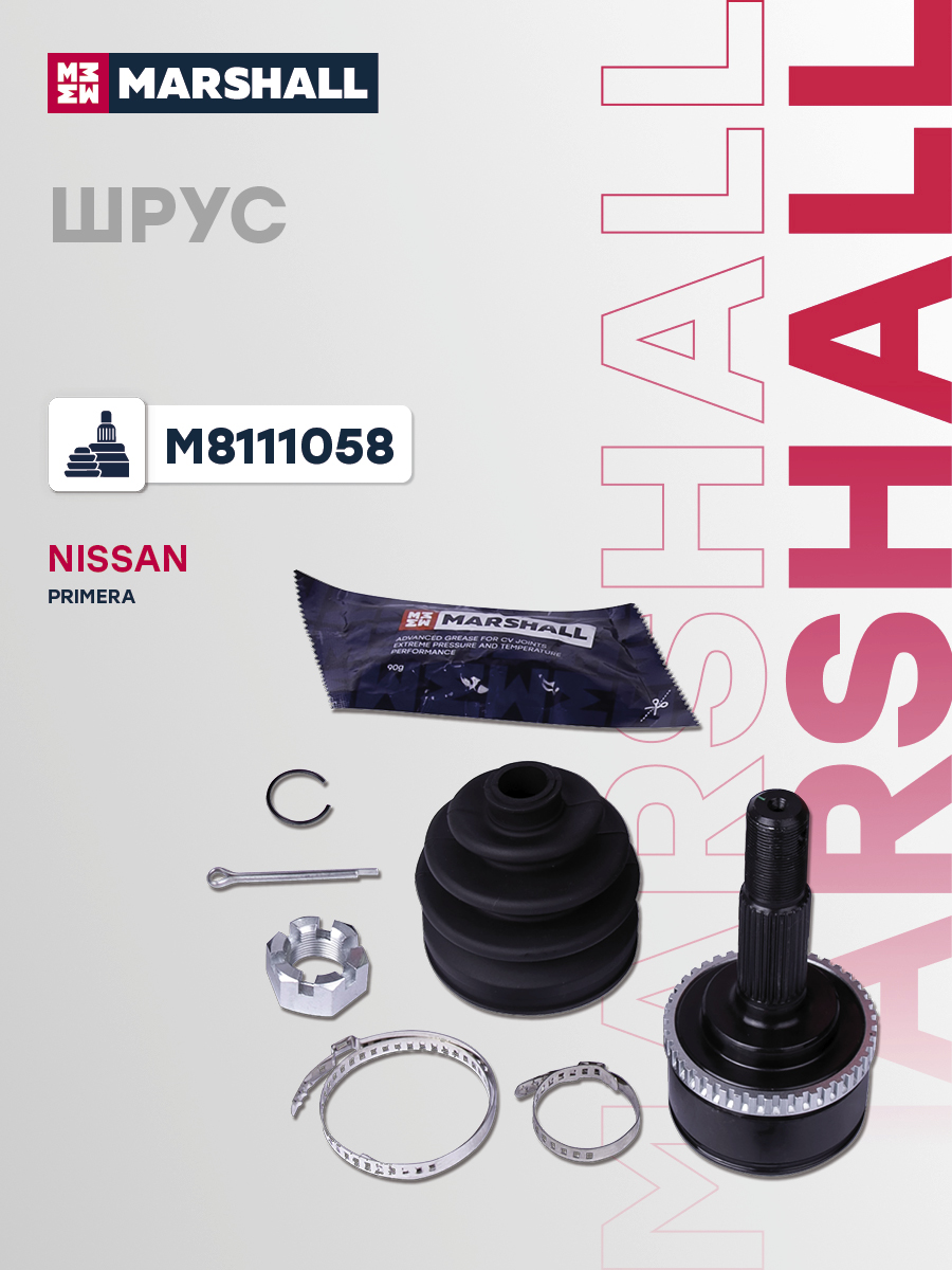 В комплект входит 1 шрус, 1 пыльник, 1 смазка, 1 гайка, 2 хомута, 1 стопорное кольцо, 1 шплинт
