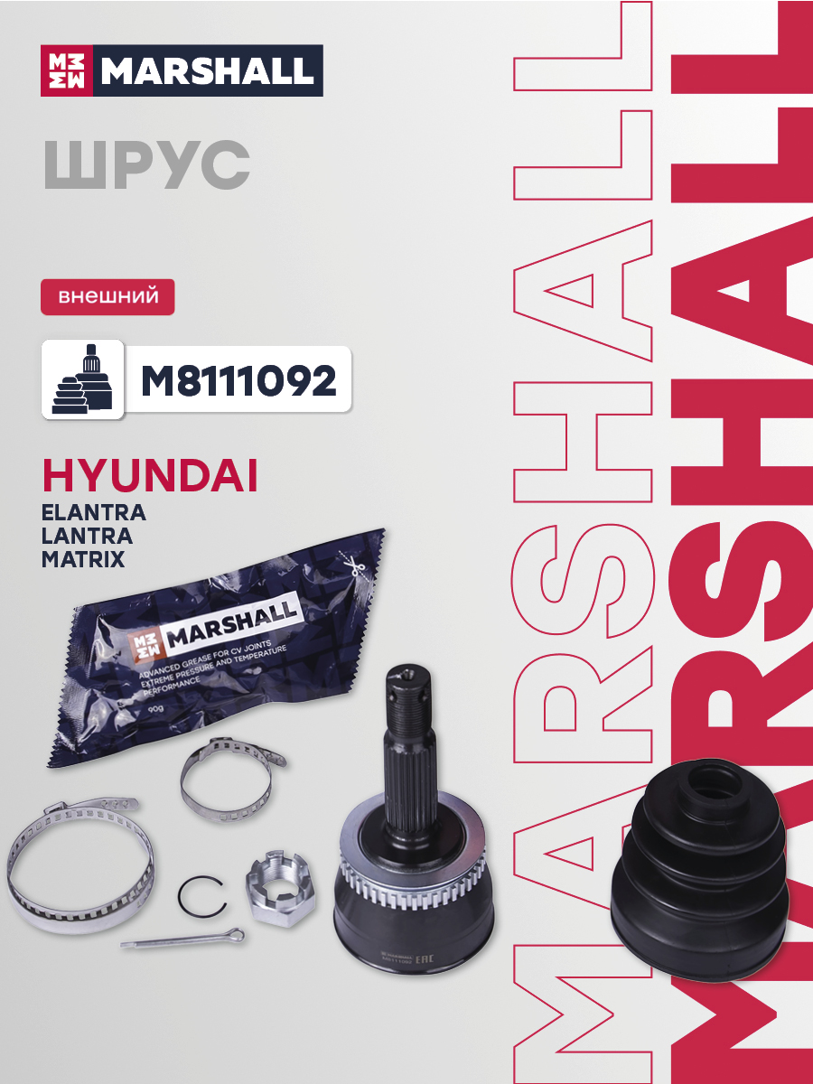 В комплект входит 1 шрус, 1 пыльник, 1 смазка, 1 гайка, 2 хомута, 1 стопорное кольцо, 1 шплинт