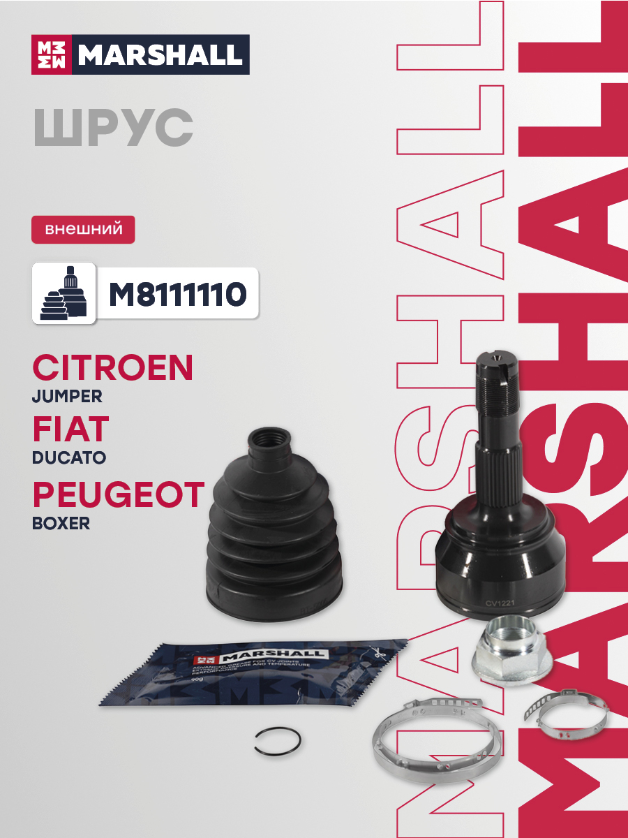 В комплект входит 1 шрус, 1 пыльник, 1 смазка, 1 гайка, 2 хомута, 1 стопорное кольцо