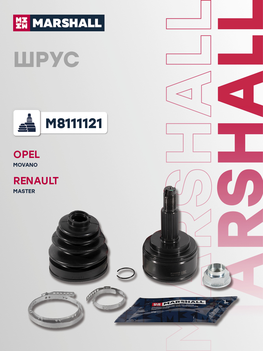 В комплект входит 1 шрус, 1 пыльник, 1 смазка, 1 гайка, 2 хомута, 1 стопорное кольцо