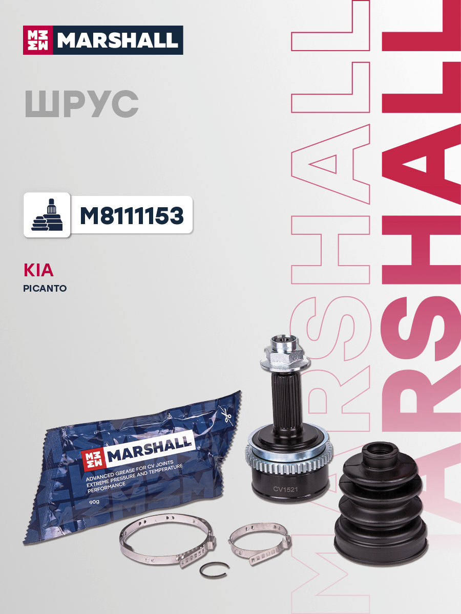 В комплект входит 1 шрус, 1 пыльник, 1 смазка, 1 гайка, 2 хомута, 1 стопорное кольцо